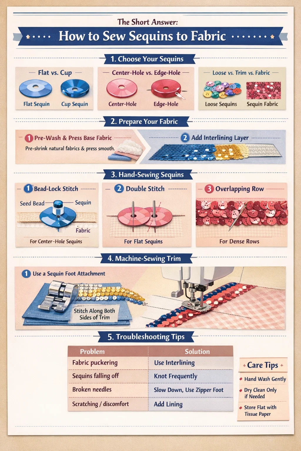 Bu kılavuz her aşamayı ele alır: doğru payetleri seçmek, kumaşınızı ve telanızı hazırlamak, tek tek parçaları elle dikmek, payet kesimini makineyle uygulamak, sık karşılaşılan sorunları gidermek ve bitmiş projenizin bakımını yapmak. Özel dikiş sayıları, iplik türleri ve tela ağırlıkları dahildir, böylece ev yapımı olmaktan ziyade profesyonel görünen sonuçlar elde edebilirsiniz.