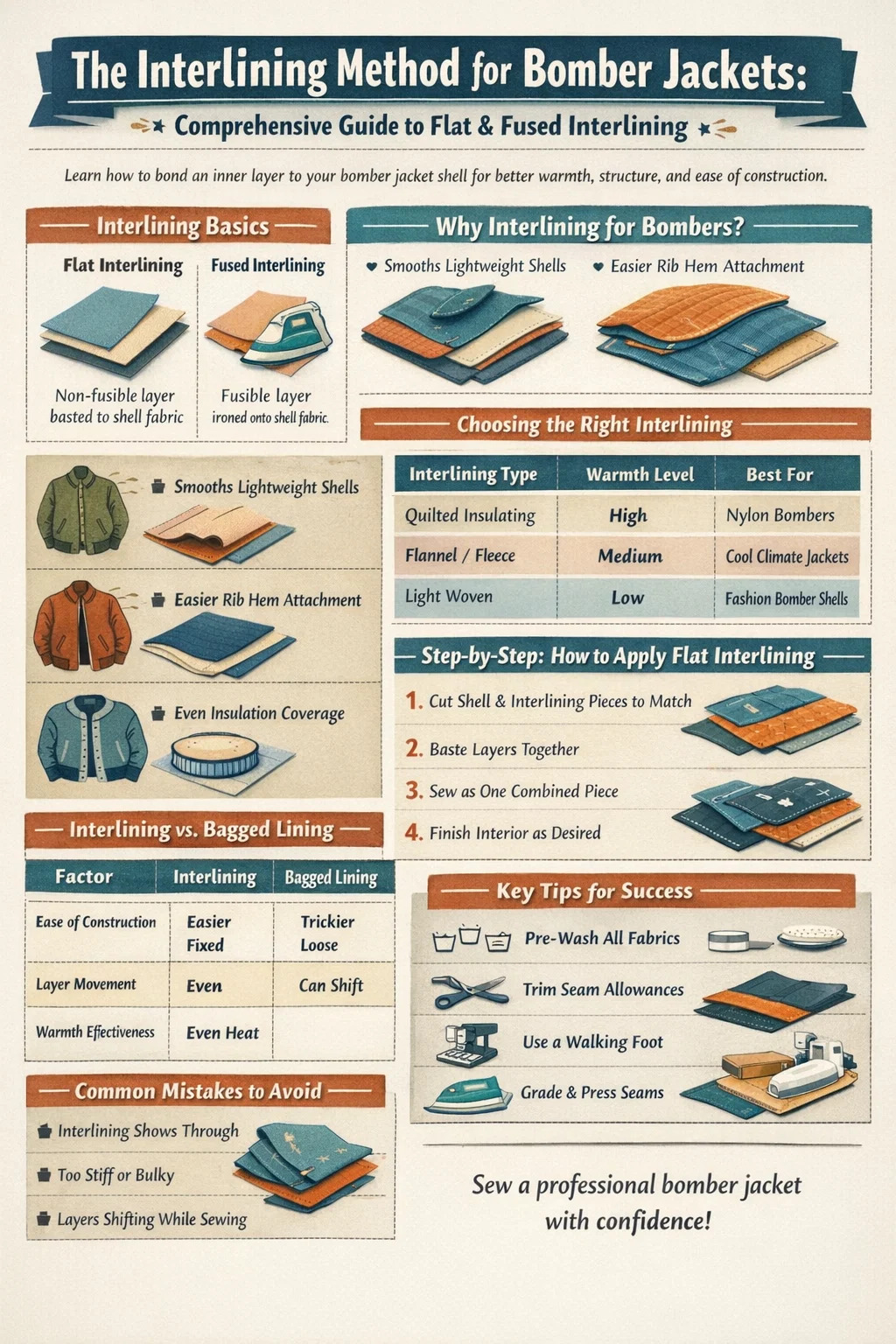 için a classic nylon MA-1 style bomber, use a pre-quilted interlining basted flat to each panel — this is both historically accurate and practically sound. için a fashion bomber in heavier fabric, a soft flannel or fleece interlining gives excellent results with minimal bulk. For a fully decorative or special-occasion bomber in velvet or brocade, a lightweight underlining keeps the shell fabric supported and reduces distortion at seams and hems without adding any unwanted stiffness.