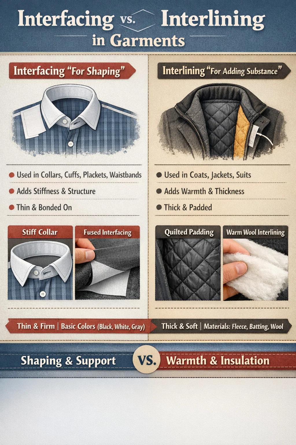 Giysi yapımında ve kumaş işlemede, tela ve arayüzeyleme, giysinin "görünmez iskeleti" ve "yalıtım katmanı" gibidir. Her ikisi de giysinin içinde saklı olsa da tamamen farklı amaçlara hizmet ederler.
